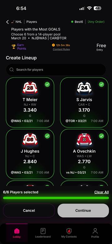 projection, you’ll see the matchup details (like @WAS • 03/21 • 7:00 AM),