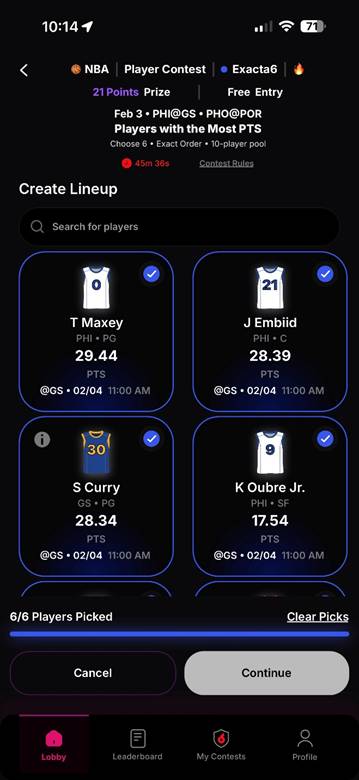 projection, you’ll see the matchup details (like @GS • 01/20 • 11:00 AM),